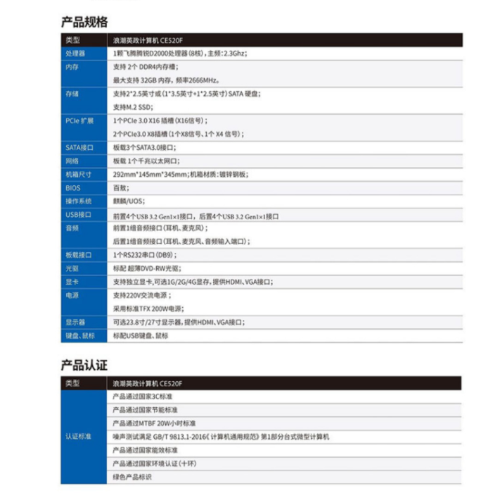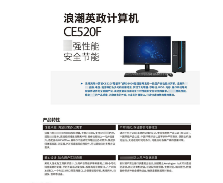 INSPUR浪潮 CE520F 1颗飞腾D2000处理器 硬盘独立显卡 8GB内存256GB SATA SSD硬盘键鼠